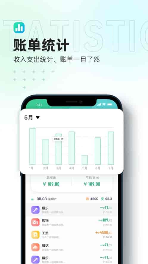 4、賬單統(tǒng)計,收入支出統(tǒng)計、賬單一目了然。