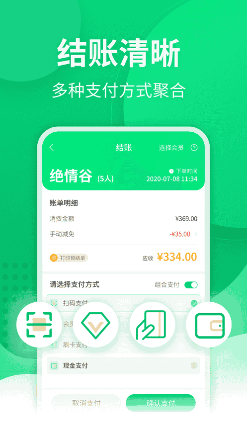 4、結賬模式簡便且多樣化,支持微信、信用卡等掃碼支付,支持會員充值卡支付,支持刷卡支付,也可以通過個人選擇進行組合支付。