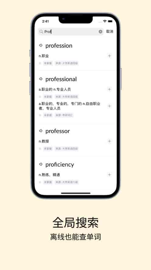 4、精選考試核心詞匯,針對(duì)性背詞,整合近十年英語類考試真題,精心收錄四級(jí)、六級(jí)、考研、財(cái)經(jīng)金融等核心詞匯,幫你高效備考,選詞不困擾。