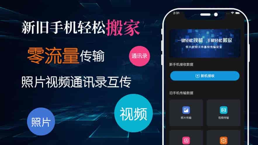 1、新舊手機輕松搬家,零流量傳輸,照片,視頻,通訊錄互傳。