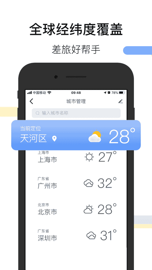 7、城市編輯和搜索,輕松刪除,添加,移動城市,為你位置需要特別關心的城市,提供天氣早晚提醒,和惡劣天氣通知等功能。
