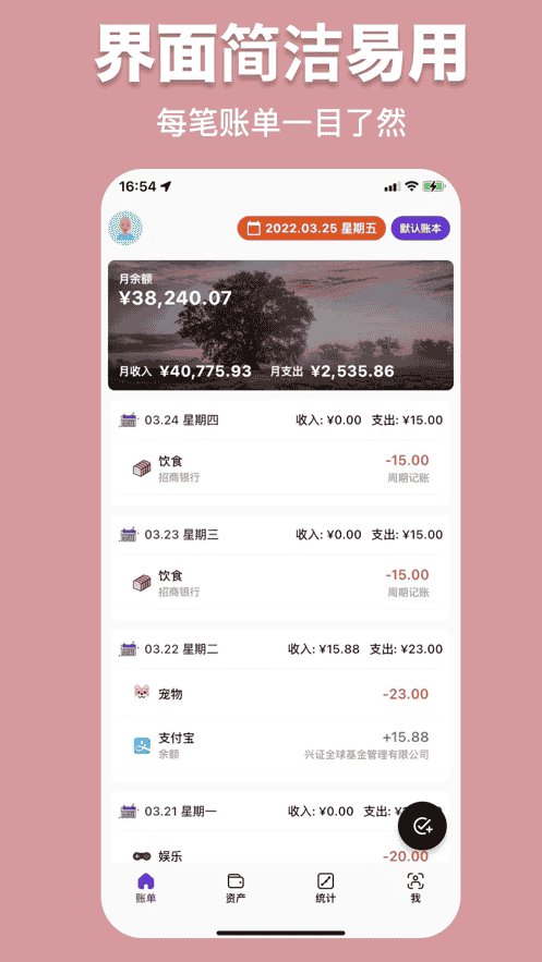 2、資產管理,支持各個銀行卡、支付寶、微信、現金錢包等資產賬戶,方便管理統計負債、凈資產,輕松知道個人財務情況。