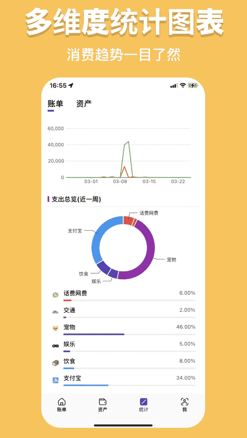 3、多維度統計圖表,你能清晰地知道每一筆消費,消費趨勢一目了然。