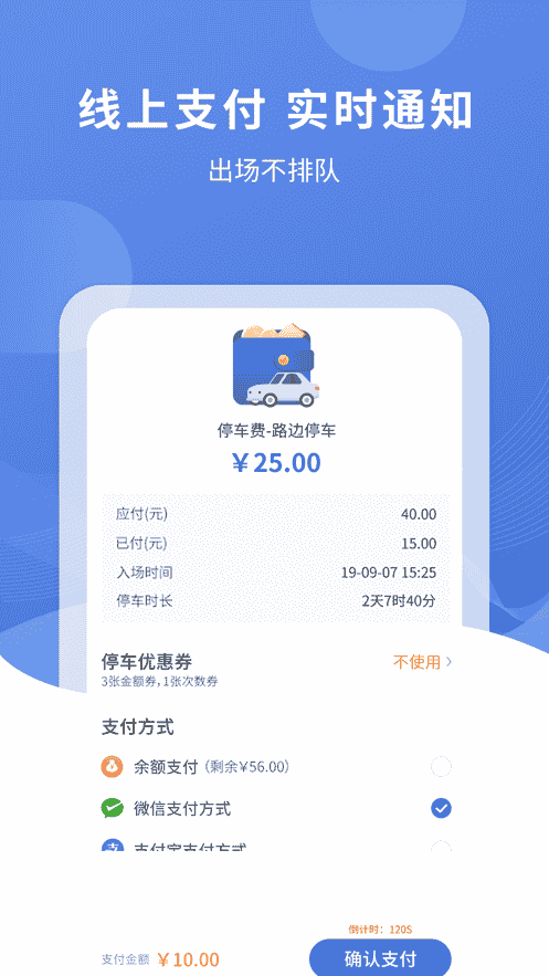 3、線上支付,實時通知,出場不排隊,后打發票。