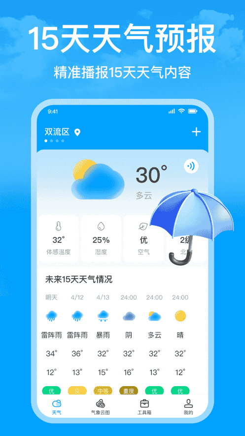 15日天氣預報App是一款使用頁面簡潔、美觀的天氣播報軟件。提供全國所有城市和當前定位城市實時天氣信息,12小時的氣溫變化,未來15天天氣預報等全面天氣信息,我們的目標是防災減災,努力捕捉每一次惡劣天氣,專注于天氣預報,解決您的出行擔憂。