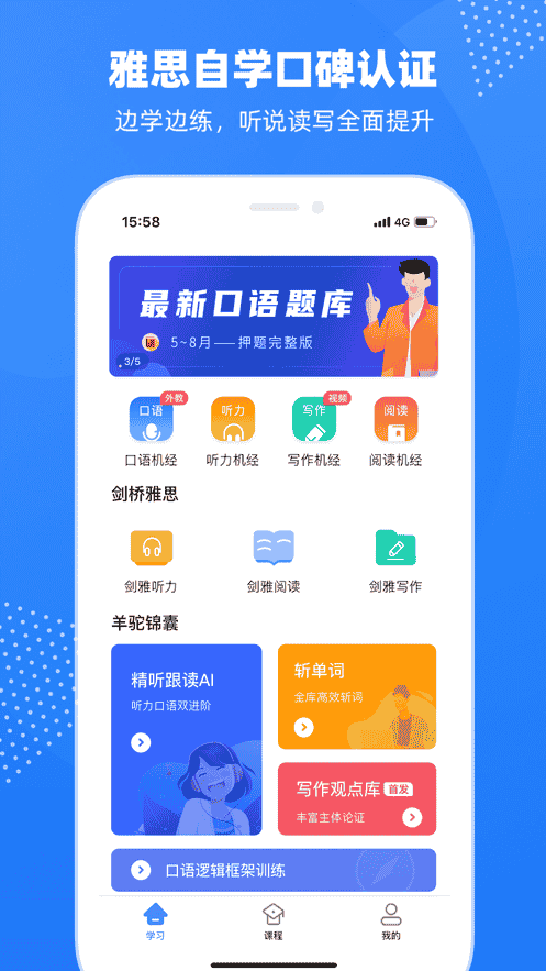 羊駝雅思極速版App,聽力、口語一站學習,平臺提供自測英語水平,大數據根據學習情況進行內容編排,真正讓同學體會到快樂學英語。