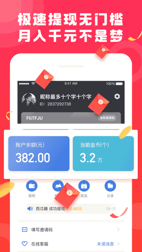 2、新手專享紅包,天天上線領錢,極速提現無門檻,月入千元不是夢。