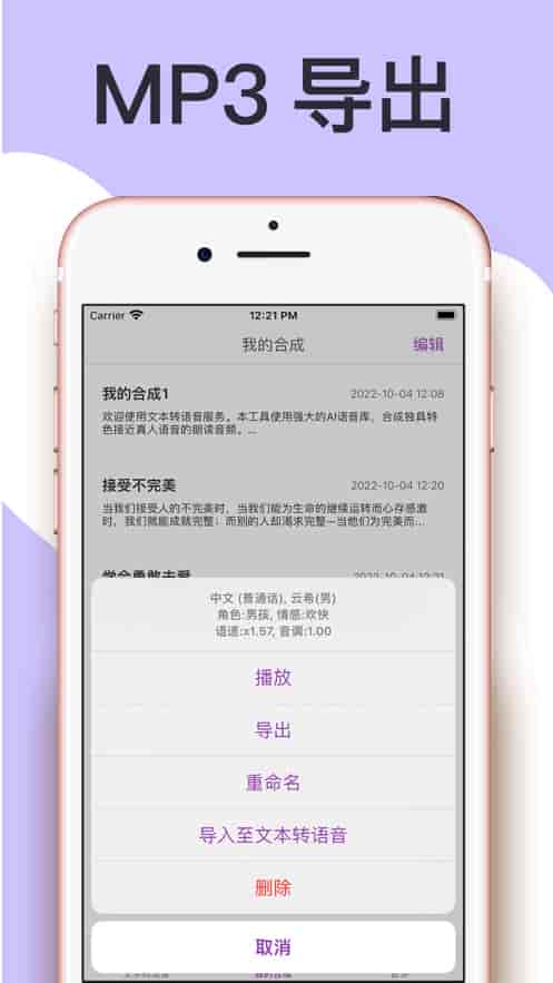 2、語音合成適用導(dǎo)出MP3、MP4、WAV文件格式:生成的文件可以拷貝到U盤或者內(nèi)存卡。