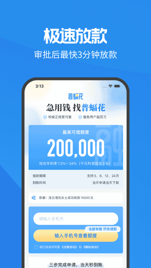 普螎花App是一款現金分期貸款借錢平臺,為您提供現金分期貸款借錢服務,解決您的應急借款需求,無需抵押,極速放款,專為客戶提供高品質、低利息的現金分期服務。