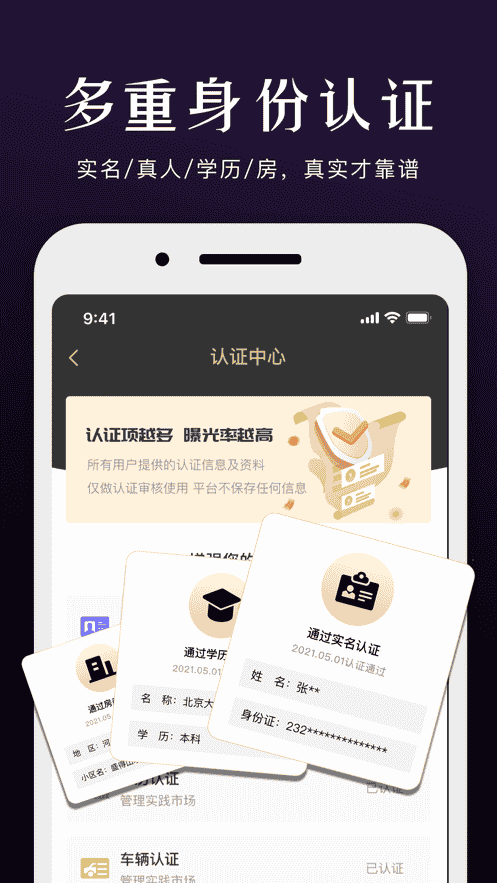 3、多重身份驗證,實名驗證、真人、學歷、房,真正資產驗證才靠譜。