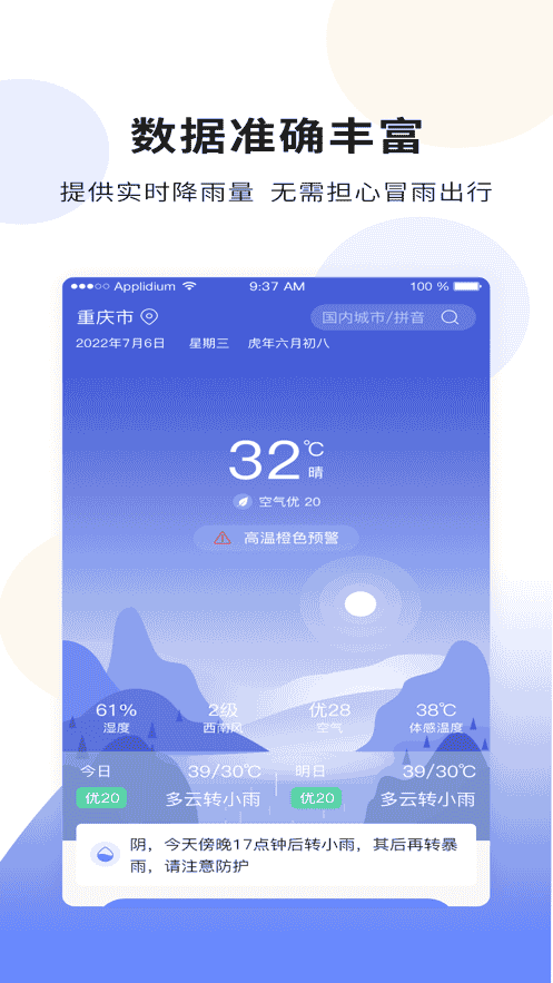 3、多方位數據支撐,一款超越手機天氣插件的APP,個性化天氣提醒,多種天氣信息,及時推送。