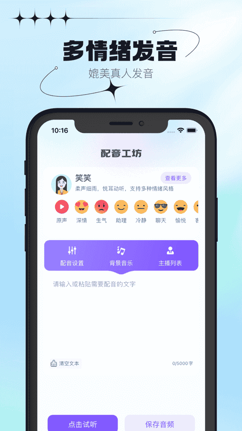 2、 大量樣音文案模板,高質量的背景音樂,為您創造配音效果。