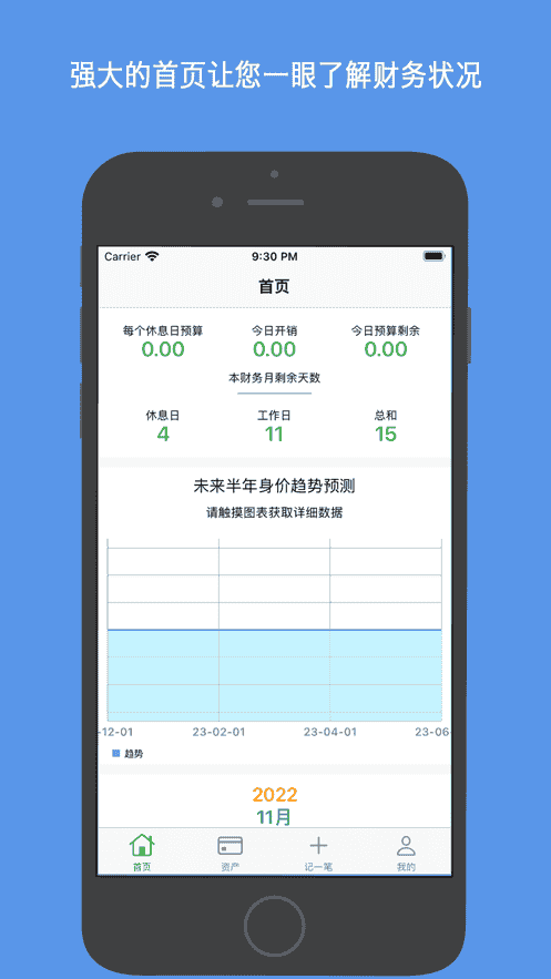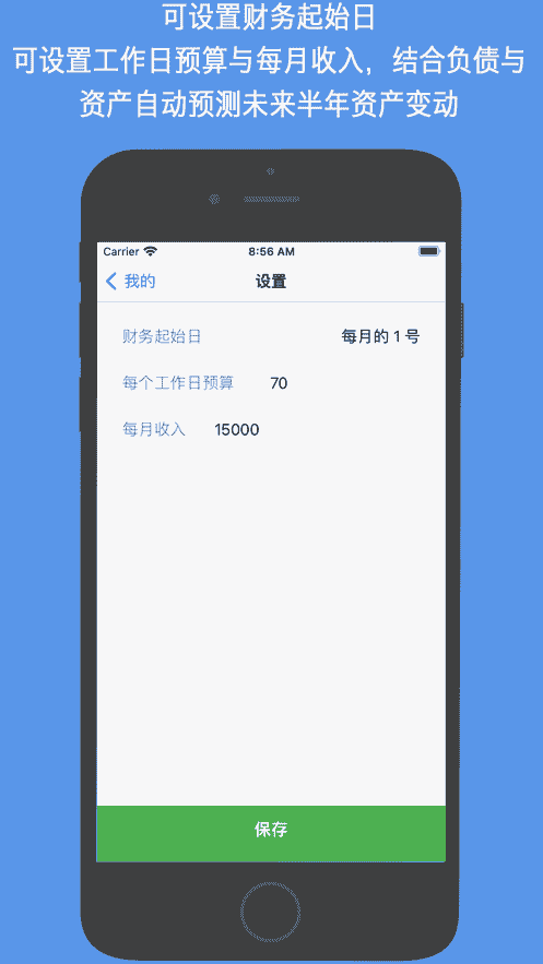 4、可設置會計開始日、工作日預算和月收入,債務與財產自動預測未來半年財產變化。