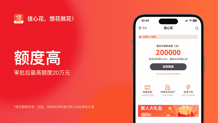 信心花App小額貸款低息貸款軟件廈門呼啦圈信息技術有限公司打造,是一個提供便捷現金貸款服務的小額快速貸款平臺,致力于解決客戶的緊急貸款要求。