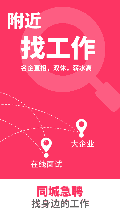 同城招聘App,找工作人才網絡,高薪緊急招聘,為申請人提供免費注冊、求職指導、職業評估等服務,工作真實可靠,反饋快速及時,在城市找工作,工作滿意!