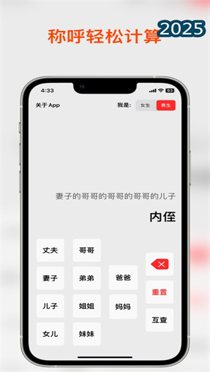 親戚稱呼計算器APP是一款專注于家庭關(guān)系計算的智能工具,旨在幫助用戶快速、準(zhǔn)確地確定親戚之間的稱呼關(guān)系。通過內(nèi)置的親屬關(guān)系算法、家族樹生成功能和智能匹配系統(tǒng),用戶只需輸入簡單的家庭成員信息,即可獲得精準(zhǔn)的稱呼結(jié)果。無論是逢年過節(jié)的家庭聚會,還是日常生活中的親戚往來,親戚稱呼計算器都能幫助用戶從容應(yīng)對,避免叫錯人的尷尬。此外,平臺還支持多語言切換、自定義稱呼設(shè)置和家族關(guān)系圖譜生成,滿足用戶多樣化的需求。