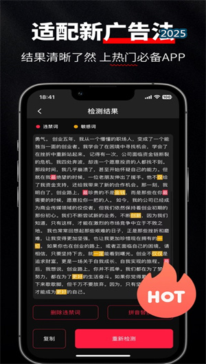 紅薯零克查詞App依托最新廣告法,提供全面的違禁詞數據庫,支持多個主流平臺的違禁詞查詢。用戶只需輸入文案內容,即可快速檢測出其中的敏感詞和違禁詞,確保文案安全合規,避免因違規內容導致的審核不通過或推流受限問題。