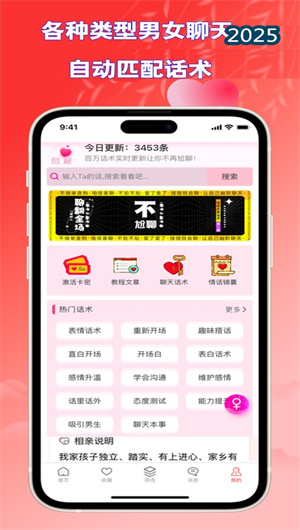 超會聊APP內置海量話術庫,涵蓋各種戀愛場景,從初遇到日常閑聊,再到矛盾化解,一應俱全。通過話術分類系統和場景匹配工具,用戶可以輕松找到適合當前聊天場景的話術。無論是心動開場白、甜蜜情話,還是巧妙化解矛盾,超會聊APP都能提供最豐富的話術選擇。