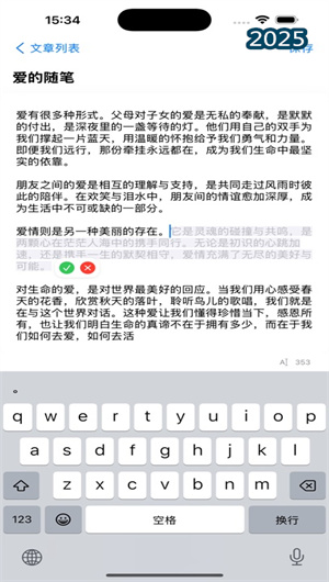 寫(xiě)作補(bǔ)全APP內(nèi)置文章管理功能,用戶可以通過(guò)標(biāo)題搜索工具和內(nèi)容檢索系統(tǒng),輕松查找和管理文章。通過(guò)多種排序方式和文章列表視圖,用戶可以按創(chuàng)建時(shí)間、字?jǐn)?shù)等條件對(duì)文章進(jìn)行排序和查看。無(wú)論是長(zhǎng)篇?jiǎng)?chuàng)作,還是短篇筆記,寫(xiě)作補(bǔ)全APP都能提供最便捷的文章管理支持。