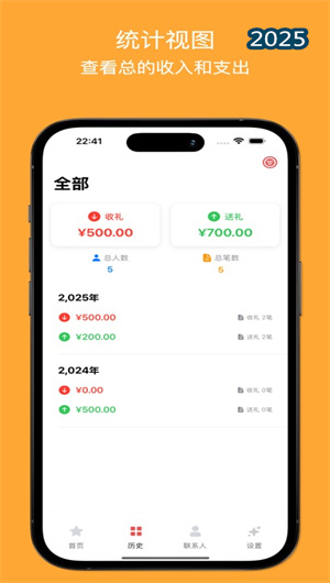 “人情賬本”提供人情往來分析功能,能夠根據用戶的禮金記錄和收支情況,生成詳細的分析報告。通過支出分布和收入來源的統計,用戶可以清晰了解自己的人情往來模式,并根據分析結果合理安排預算規劃。此外,趨勢預測功能還能根據歷史數據,預測未來的人情支出,幫助用戶提前做好財務準備。