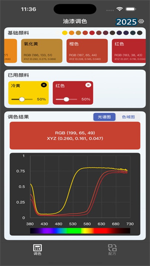 油漆調色助手APP內置Kimera顏料的測量數據,用戶可以選擇不同的顏料并調整混合比例。系統會實時更新混合顏色的效果,幫助用戶找到最理想的配方。這一功能特別適合需要靈活調整配方的用戶,提供了豐富的顏料選擇和比例控制。