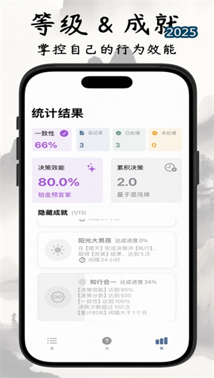 3 段位系統(tǒng)與隱藏成就:遇事決App通過「段位系統(tǒng)」功能,系統(tǒng)會根據(jù)用戶的決策效能和決策力動態(tài)評分,生成段位等級,激勵用戶提升決策能力。平臺還提供了「成就圖鑒」功能,用戶可以解鎖隱藏彩蛋和成就,增加使用的趣味性。此外,用戶還可以通過「動態(tài)評分」功能,系統(tǒng)會根據(jù)執(zhí)行力和結(jié)果力混合算法,評估用戶的行動力,幫助用戶優(yōu)化決策模式。