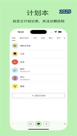 計劃本App支持自定義計劃本分類,用戶可以為每個計劃本設置一個主題,專注于長期目標的實現。通過計劃本創建、分類管理和主題設置等功能,用戶可以輕松管理多個計劃本。此外,App還支持計劃本共享和協作功能,用戶可以與團隊成員共同管理計劃本,提升協作效率。