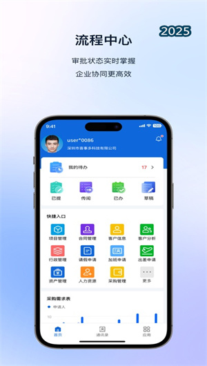 快鷺云 App 提供人事管理、財務管理、行政管理和采購管理四大核心辦公應用,涵蓋企業日常運營的各個方面。通過業務應用模板和模塊化設計,企業可以快速部署和啟用所需功能,實現開箱即用。此外,通用辦公應用還支持功能擴展和定制開發,滿足企業的個性化需求。
