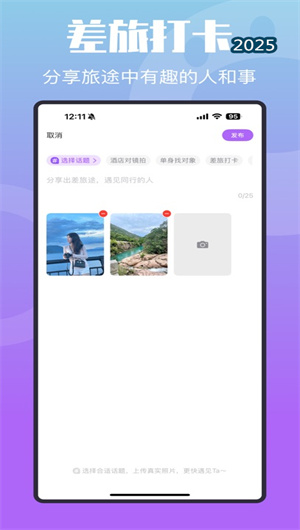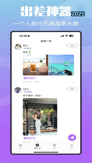 泡泡差旅APP是一款專為經常出差旅行的人群設計的高端商務差旅社交軟件,旨在為用戶打造一個集附近交友、差旅分享、線下約會功能為一體的互動平臺。通過泡泡差旅APP,用戶可以快速發現附近同城的其他出差人群,查看他們的差旅動態,結識同行伙伴,甚至可能遇到命中注定的TA。無論是商務差旅還是休閑旅行,泡泡差旅APP都能為用戶提供便捷的社交互動體驗,讓出差不再孤單。
