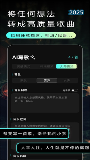 來曲AI搭載了多模態生成模型,用戶只需選擇36種細分音樂風格(如流行、電子、古風等),輸入創意關鍵詞,系統即可通過語義分析算法自動匹配最合適的和弦進行、節奏型和配器方案。其風格遷移技術可確保生成的音樂符合目標流派特征,同時支持動態情緒調節,讓作品在激昂、舒緩等不同情感維度上自由切換。此外,AI輔助作曲功能還能根據用戶輸入的片段智能補全旋律,提升創作流暢度。