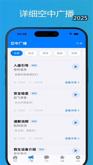 1. 標準廣播訓練系統:空乘口語APP的廣播詞庫完整收錄起飛、降落、顛簸等各類客艙廣播場景,每段廣播均提供原聲示范和文本對照。跟讀評分功能實時分析發音準確度,語速調節支持0.5-1.5倍速練習,重難點標記幫助針對性突破,全方位提升用戶的廣播播報能力。