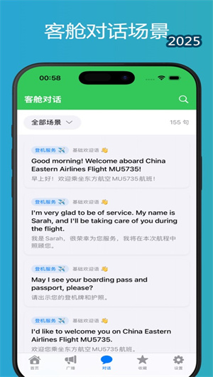 2. 情景對話模擬器:空乘口語APP開發了20+種客艙服務場景,包括餐食服務、特殊旅客照顧等常見情境。角色扮演功能支持用戶選擇乘務員或乘客視角,智能語音交互模擬真實對話流程,應急對話模塊專門訓練突發情況下的英語應對能力。