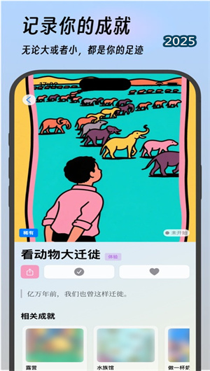 呈跡獨創的成就確認動畫和里程碑慶祝系統,為各種大小的成就賦予同等重要的儀式感。從"買一朵花"到"登頂珠峰",每個成就都能獲得獨特的視覺反饋效果。數據顯示,使用該功能后用戶持續記錄的時間延長3倍以上。