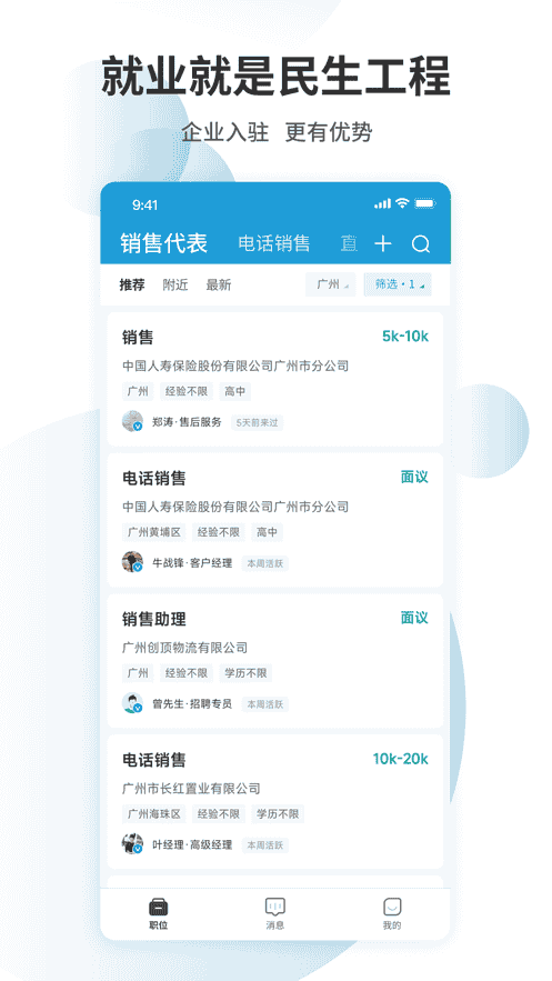 廣州直聘APP,大量工作,專人審批,網上簡歷,網上交流,節約成本和車費;工作種類豐富,一應俱全。