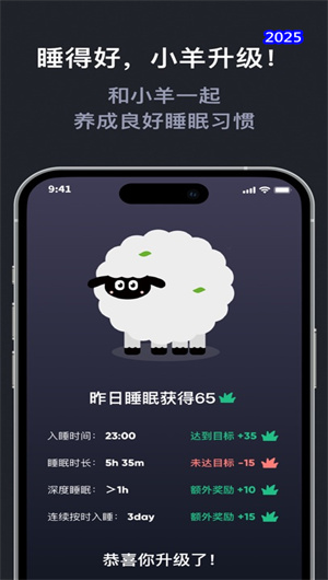 用戶的睡眠表現直接影響虛擬小羊的狀態,睡眠得分越高,小羊獲得的成長值(EXP)越多,從而解鎖新外觀或道具。系統采用動態獎勵機制,如連續早睡可觸發成就徽章,而熬夜會導致小羊心情下降。此外,睡眠目標挑戰功能允許用戶設定每周睡眠時長目標,達成后獲得稀有裝飾獎勵,進一步強化行為正反饋。