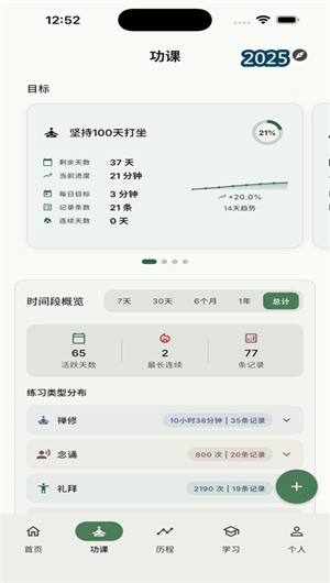 專為禪修練習設計,提供多模式計時器:普通計時、間隔鐘聲(如每15分鐘提醒一次)、無信號模式(屏蔽外界干擾)。禪修結束后自動生成session報告,包含持續(xù)時間、預設目標完成度、以及通過手機傳感器(如陀螺儀)推算的身體晃動頻率曲線。數據自動匯入水滴修行數據中心,用戶可查看長期趨勢圖,如每月總禪修時長分布、不同禪修類型(如內觀、慈悲觀)的時間占比,從而調整實修計劃。