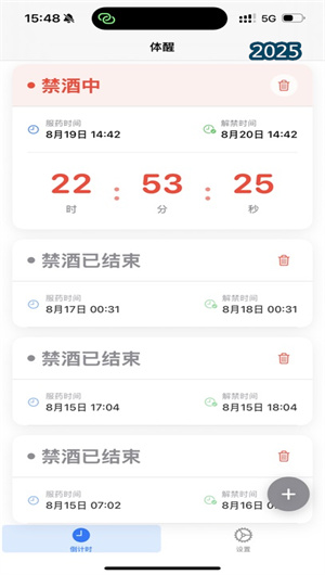 1. 智能藥物計時系統:體醒App內置藥物數據庫,包含各類藥物的藥代動力學參數和酒精相互作用數據。用戶輸入藥物類型和服用時間后,系統通過半衰期計算算法自動生成精準的安全禁酒時長,并在倒計時界面實時顯示剩余時間。應用支持多藥物同時監測,能夠智能處理藥物相互作用情況,提供最保守的安全建議。