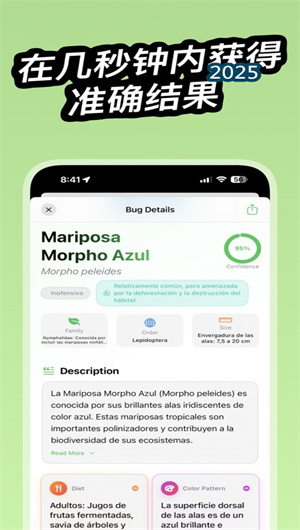 2. 綜合性昆蟲百科數據庫為用戶提供了超越識別的知識深度。每一次成功識別后,系統會從結構化物種數據庫中調取該昆蟲的詳細學名、常見俗名、分類樹(界門綱目科屬種)以及全面的生物特征描述。數據庫內容由昆蟲學專家團隊審核,涵蓋生活習性、地理分布、季節性活動規律等生態學參數,并配有高清標本參考圖集,形成一個隨時可查的數字昆蟲圖鑒。