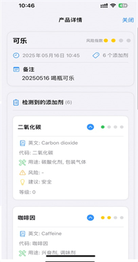 2、安全級別提示:識別完成后,系統會根據權威數據庫對添加劑進行安全級別判斷,并用清晰的提示方式展示結果,幫助用戶快速做出購買與食用決策。