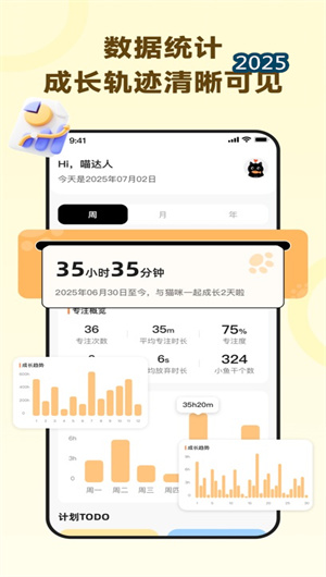 2. 多端同步生態(tài)支持手機端、平板端與電腦端數(shù)據(jù)實時同步,專注記錄與貓咪成長狀態(tài)通過云端加密同步無縫切換。特別優(yōu)化手表端輕量控制功能,可實現(xiàn)快捷開始專注與振動提醒通知,滿足多場景使用需求。
