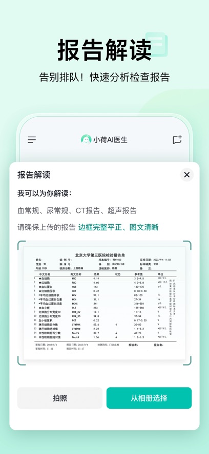 2、多模態(tài)報告解讀:軟件支持包括血常規(guī)、影像學、心電圖在內(nèi)的多類檢查項目的智能化識別,上傳化驗單即可解析千余項指標,并提供動態(tài)健康圖譜。系統(tǒng)可直觀展示數(shù)據(jù)趨勢變化,對異常指標進行標注,并生成就醫(yī)準備清單,提升就診效率。