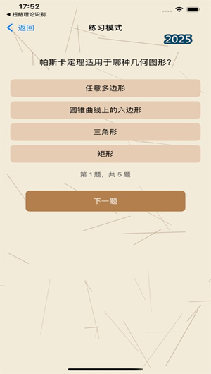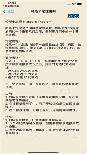 2. 多維度教學模塊包含定理演繹動畫、分步證明演示和歷史背景介紹三個層次。通過數學符號渲染引擎清晰展示帕斯卡定理的代數表達式,配合語音講解同步功能闡述射影幾何原理。每個教學環節都配備交互式例題,用戶可在引導式學習路徑中逐步掌握定理的證明方法和應用場景。