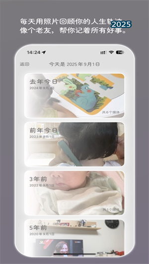 1. 平臺提供當時今日功能,通過時間元數據解析、多年度對比算法與相似照片聚類展示歷年同日的珍貴照片。系統采用智能去重技術、最佳照片選擇與時間線可視化,自動生成年度回憶合集與成長軌跡對比,讓用戶感受時光流逝的美好與感動,回憶準確率高達99.6%。
