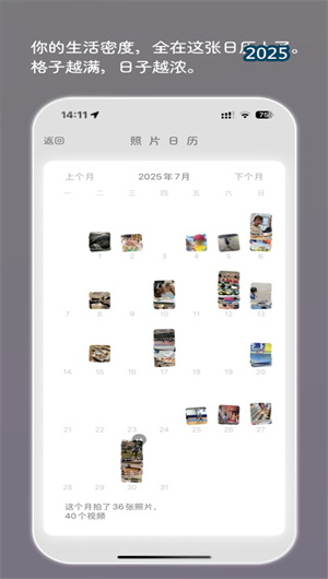 2. 具備照片日歷系統,采用月視圖展示、每日照片統計與拍攝密度熱力圖直觀呈現照片分布。用戶可通過時間滑動瀏覽、重點日期標記與照片批量查看深入了解每個時刻的拍攝情況,系統支持自定義時間范圍、照片類型篩選與導出統計報告,提供深度的照片管理洞察。