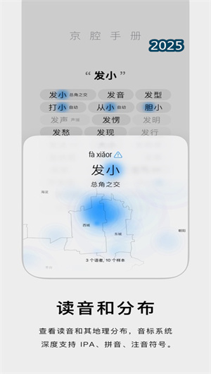 2. 地理語(yǔ)言學(xué)與語(yǔ)音分布可視化:應(yīng)用創(chuàng)新性地集成語(yǔ)音地理標(biāo)記技術(shù),將方言發(fā)音數(shù)據(jù)與電子地圖平臺(tái)相結(jié)合,生成動(dòng)態(tài)語(yǔ)音分布熱力圖。用戶可直觀查看特定詞匯在北京各區(qū)域的使用頻率和發(fā)音差異,通過(guò)區(qū)域?qū)Ρ确治龉δ鼙容^城區(qū)與郊區(qū)的語(yǔ)音變異規(guī)律。系統(tǒng)還提供發(fā)音人 demographic 數(shù)據(jù),包括年齡、職業(yè)等背景信息,助力語(yǔ)言學(xué)研究。