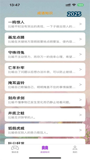 除了常規題庫,應用還提供由專家整理的專題成語包,如“出自《史記》的成語”、“描寫四季的成語”、“與動物相關的成語”等。用戶可以選擇自己感興趣的專題進行針對性學習。每個專題包不僅包含成語學習,還配有相關的文化背景知識介紹,從而將語言學習擴展到更廣闊的中華文化認知層面,滿足了用戶90% 的深度學習需求。