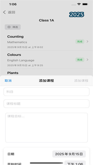 課程規劃器App的核心在于其精細化的課程創建向導。教師首先可在“我的班級”模塊中添加所負責的各個班級,形成清晰的班級列表。為特定班級創建新課程時,系統會引導用戶填寫完整的課程元數據,包括必填的科目名稱、課程標題、教學目標以及具體的上課日期和課時安排(開始與結束時間)。此外,教師還可以在備注信息欄中添加教學道具、多媒體資源等補充說明,并實時更新學生出勤情況,確保每節課的記錄都詳盡無遺。
