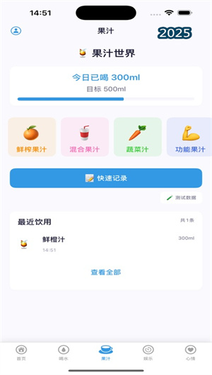 1. 智能化飲水管理:果了個汁的核心功能始于其科學的飲水管理模塊。系統會根據用戶輸入的體重、年齡等信息,通過內置算法生成一個個性化每日喝水目標設置,確保目標的科學性與合理性。為了幫助用戶達成目標,App會發送智能喝水提醒,避免因忙碌而忘記補水。每一次飲水記錄后,主界面上的可視化水杯進度顯示會以生動直觀的動畫效果實時更新,讓用戶對完成進度一目了然。此外,App提供了多種快速記錄方式(100ml-500ml),用戶只需一鍵點擊即可記錄常規飲水量,極大提升了記錄的便捷性。