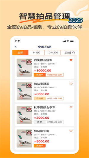 3. 智能場次管理:基于用戶偏好與競拍歷史,系統智能推送符合個人需求的拍賣場次與重點拍品。場次日歷支持自定義關注與提醒設置,同時提供保證金在線繳納與退款管理功能。鴿友可通過虛擬展館360度查看賽鴿形態特征,不錯過任何心儀場次,實現個性化競拍體驗。