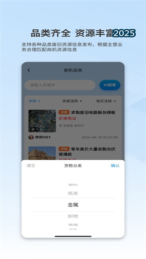 2. 實(shí)時(shí)行情監(jiān)測:通過數(shù)據(jù)采集接口整合全國主要再生資源交易市場的價(jià)格數(shù)據(jù),構(gòu)建涵蓋廢金屬、廢紡織、廢電子等八大類目的實(shí)時(shí)行情指數(shù)。行情看板支持自定義品類關(guān)注與價(jià)格預(yù)警設(shè)置,當(dāng)價(jià)格波動超過閾值時(shí)自動推送提醒。所有行情數(shù)據(jù)經(jīng)過清洗與標(biāo)準(zhǔn)化處理,為行業(yè)參與者提供公允的市場參考,降低信息不對稱導(dǎo)致的交易風(fēng)險(xiǎn)。